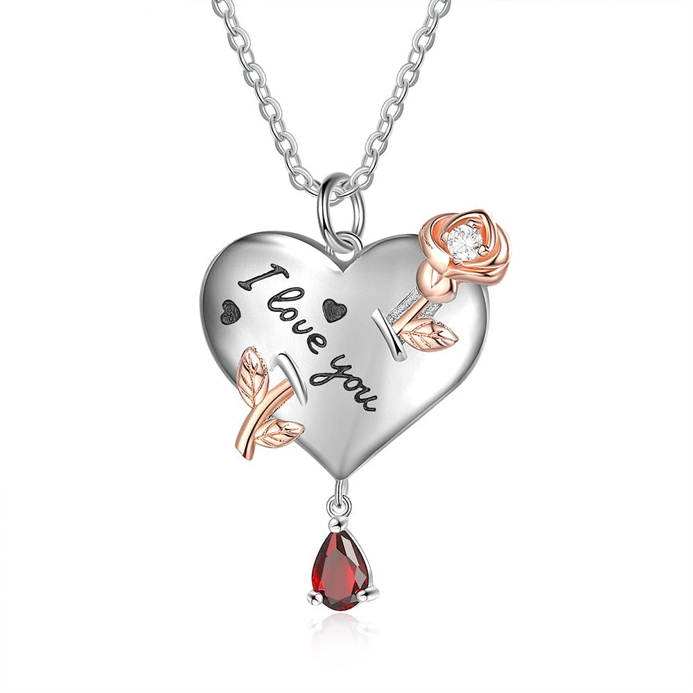 Collar personalizado con nombre grabado y piedra de nacimiento "Te amo", rosa, flor y corazón