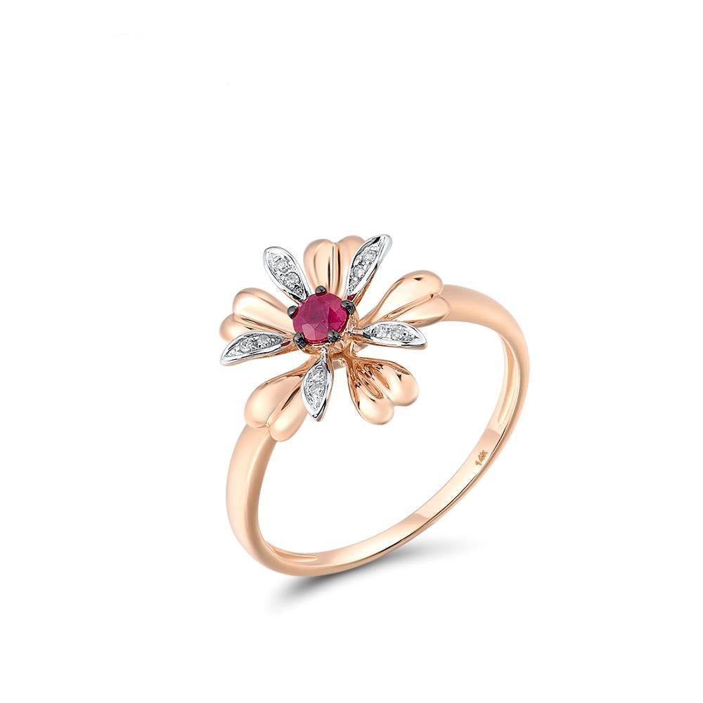 Anillo de oro rosa 585 de 14 quilates con rubí y diamante en forma de flor para dama, ideal como regalo de boda, compromiso, aniversario o joyería fina.