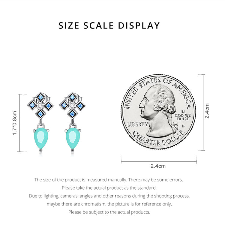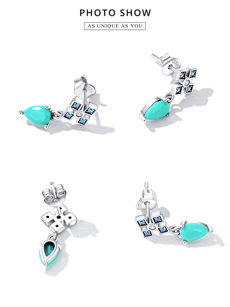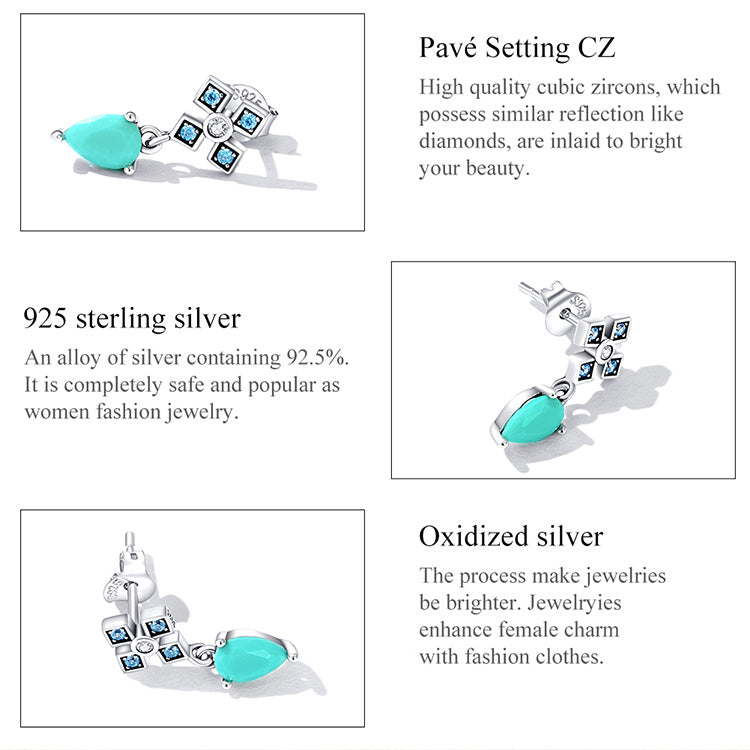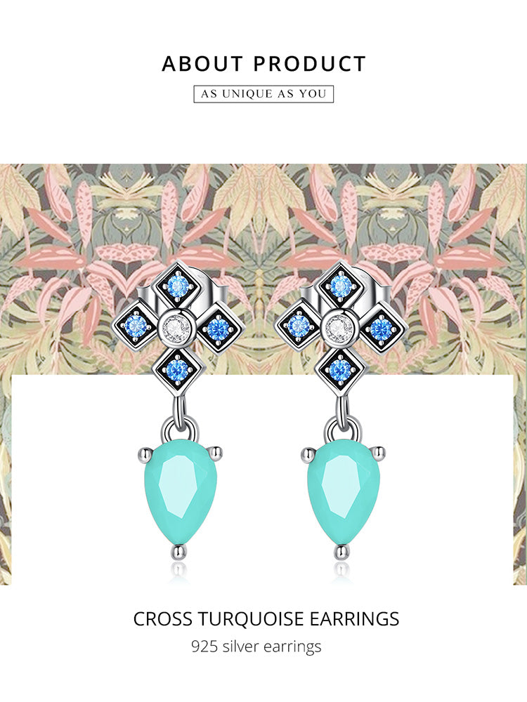 Pendientes de turquesa con diseño de cruz en plata de ley 925 y gota de agua