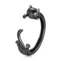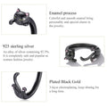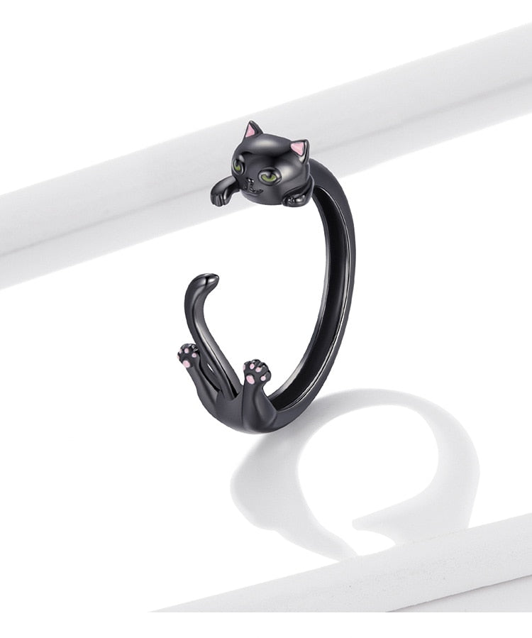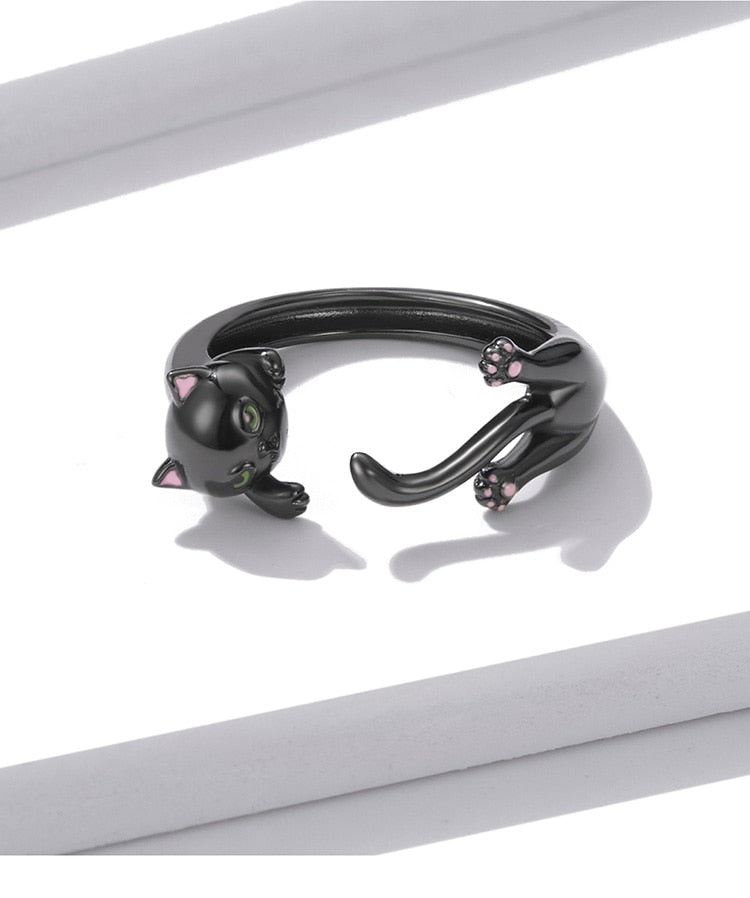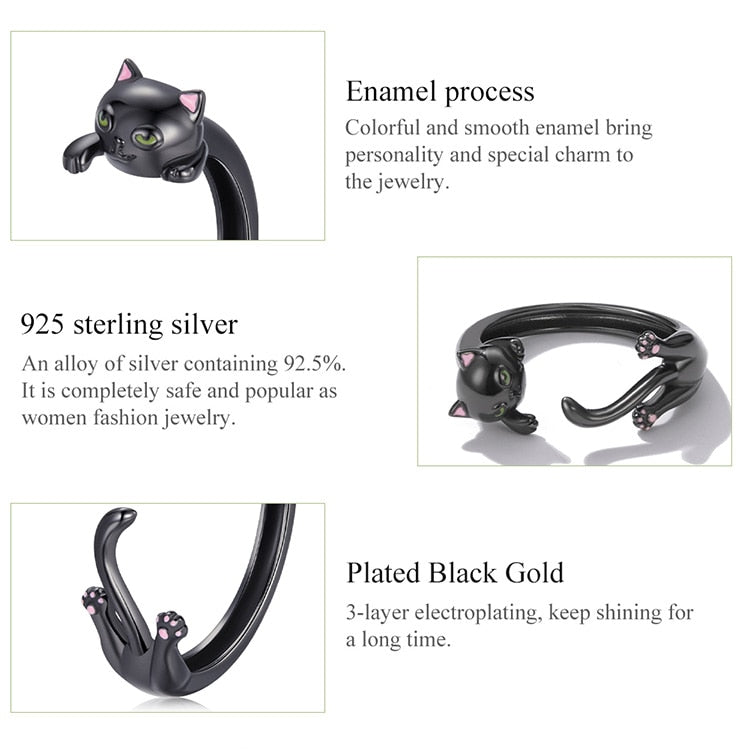 Anillo ajustable de gato negro oscuro en plata de ley 925