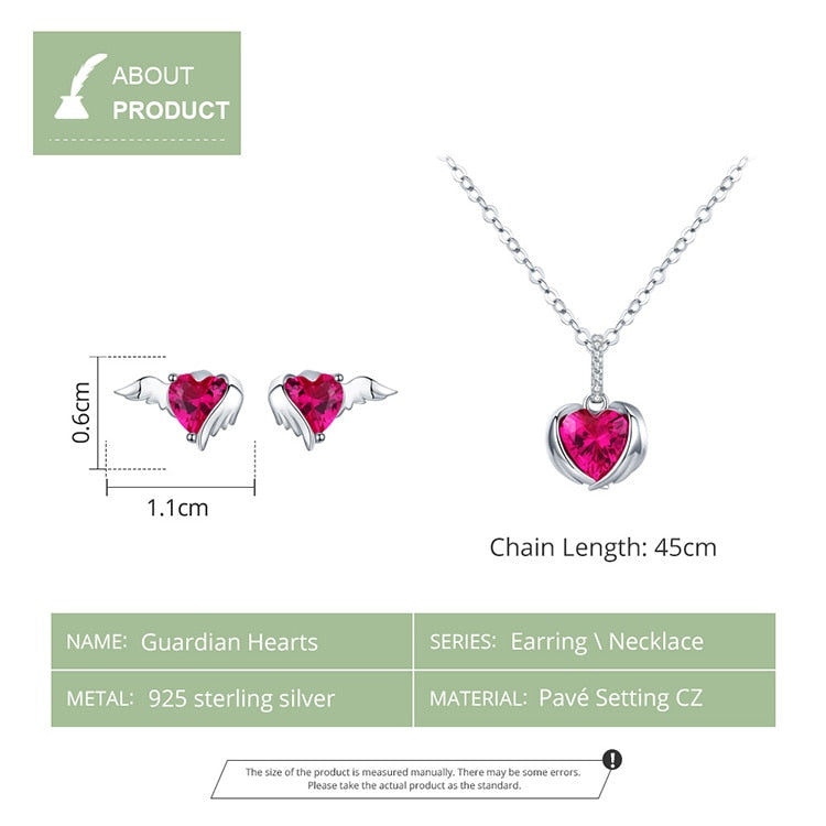 Luce la elegancia y la protección con nuestros pendientes de botón con colgante de corazón y alas de guardián en plata de ley 925. Este impresionante conjunto presenta delicados diseños en forma de corazón adornados con alas de guardián, elaborados en plata de ley 925 de alta calidad. El collar y los pendientes se pueden usar juntos o por separado, lo que los convierte en una adición versátil a tu colección de joyas.