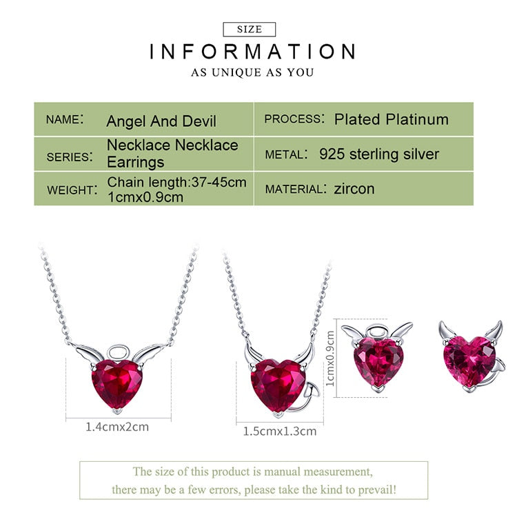 Dale un toque de elegancia a tu estilo con nuestro conjunto de aretes de ángel y mal rojo de plata de ley 925. Este cautivador conjunto presenta diseños impactantes que representan la dualidad del bien y el mal, elaborados en plata de ley 925 de alta calidad y acentuados con elementos rojos. Perfecto para añadir un toque atrevido y único a cualquier atuendo.