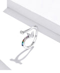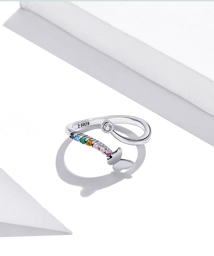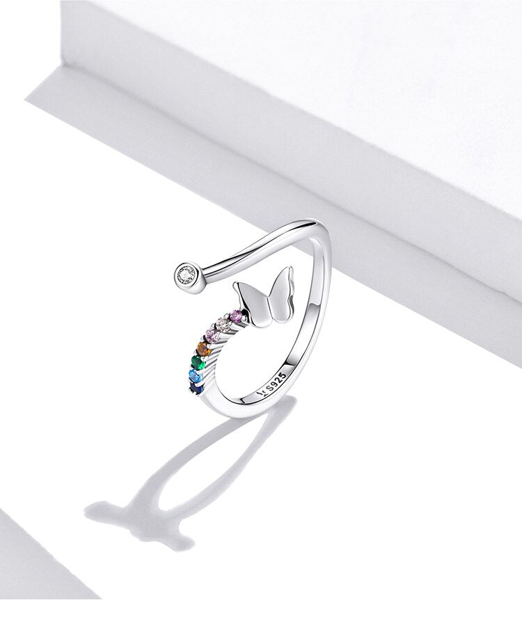 Dale un toque de color y fantasía a tu colección de joyas con nuestro Anillo Mariposa Arcoíris de Plata de Ley 925. Esta exquisita pieza luce un hermoso diseño de mariposa adornado con vibrantes piedras de colores del arcoíris, elaborado en plata de ley 925 de alta calidad.