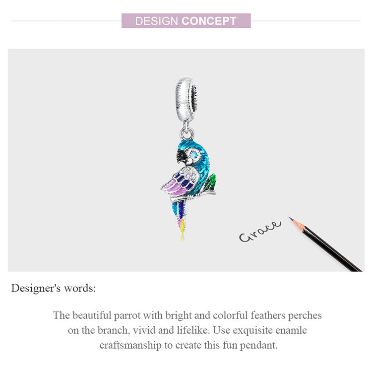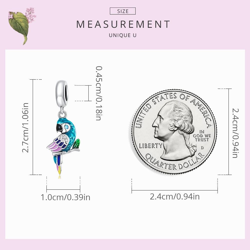 Dijes de pájaro delicado de loro de plata de ley 925 con detalles brillantes y vivos