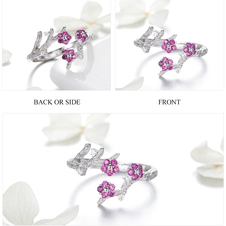 Anillo de ciruelo en flor de invierno en plata de ley 925