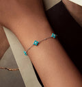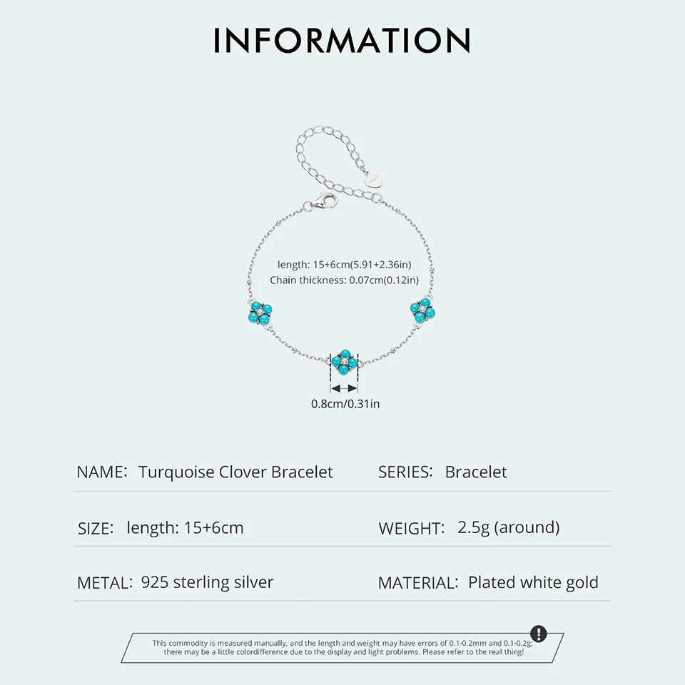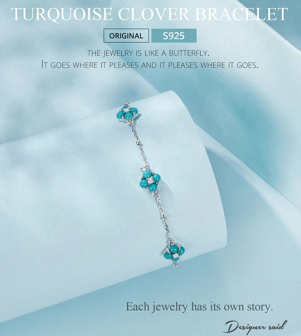 Dale un toque de elegancia natural a tu estilo con nuestra Pulsera de Trébol Turquesa en Plata de Ley 925. Esta impresionante pieza presenta un diseño de trébol de cuatro hojas de hermosa elaboración con vibrantes detalles en turquesa, engastado en plata de ley 925 de alta calidad. Perfecta para añadir un toque de encanto y sofisticación a cualquier look.