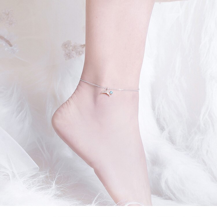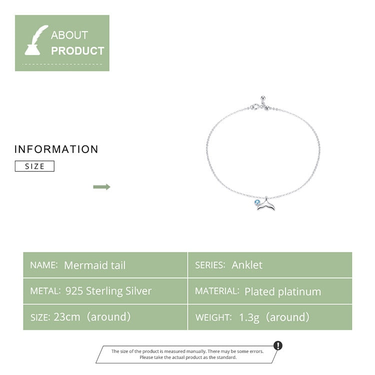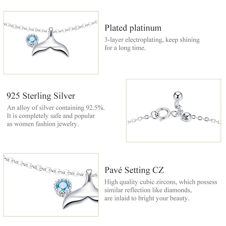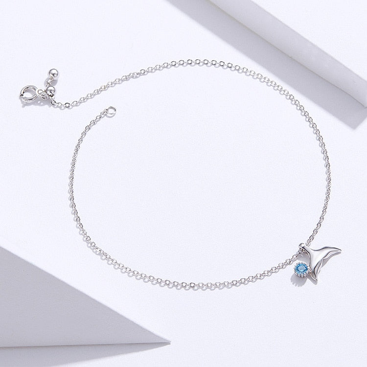 Tobillera de plata de ley con forma de cola de pez sirena del océano azul