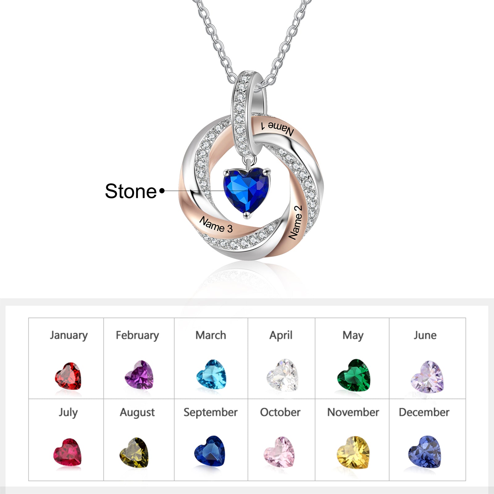 Collar personalizado con piedra de nacimiento de corazón y 3 nombres grabados