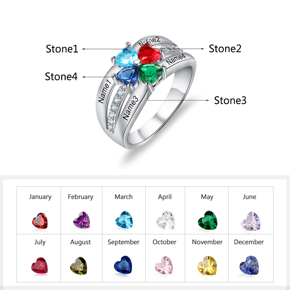 Anillo personalizado con 4 piedras de nacimiento de corazón y nombre familiar