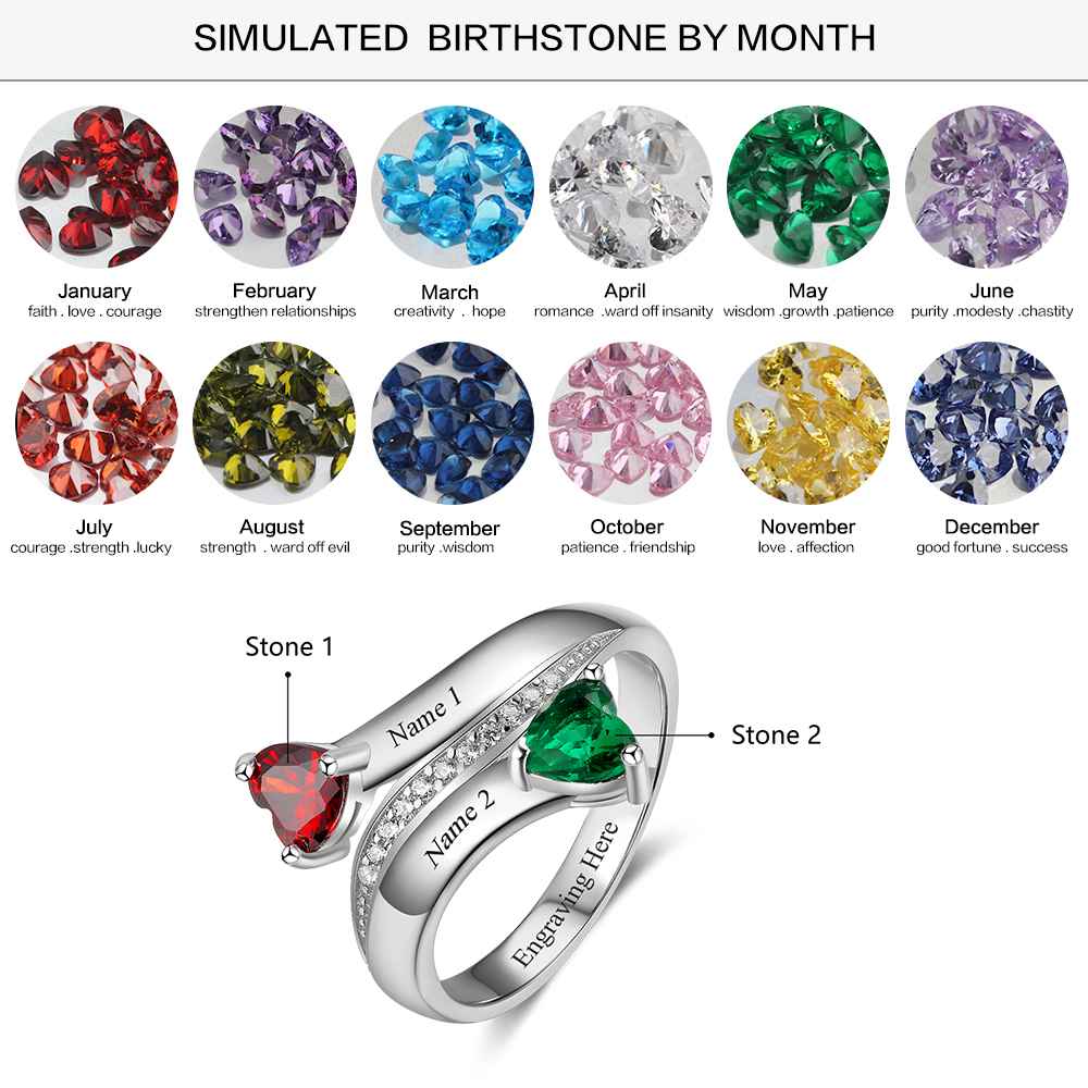 Anillo personalizado con piedra de nacimiento de corazón y dos nombres grabados