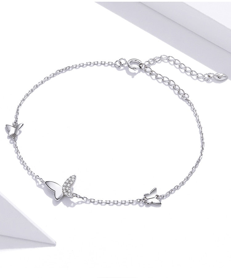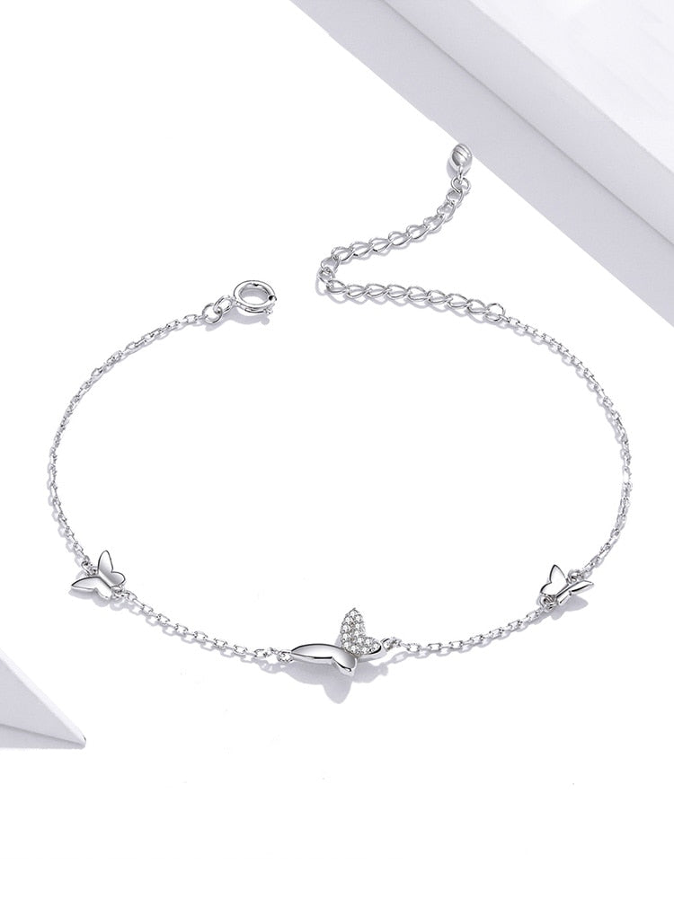 Pulsera de cadena con cierre de langosta y mariposa voladora de plata de ley