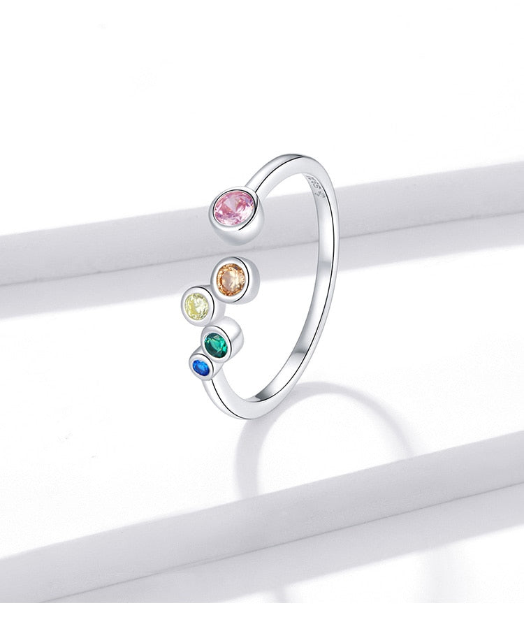 Dale un toque de elegancia y alegría a tu colección de joyas con nuestro Anillo de Burbujas Coloridas con Sello de Plata de Ley 925. Esta exquisita pieza presenta un diseño de sello único adornado con vibrantes y coloridas burbujas de circonitas, elaborado en plata de ley 925 de alta calidad.