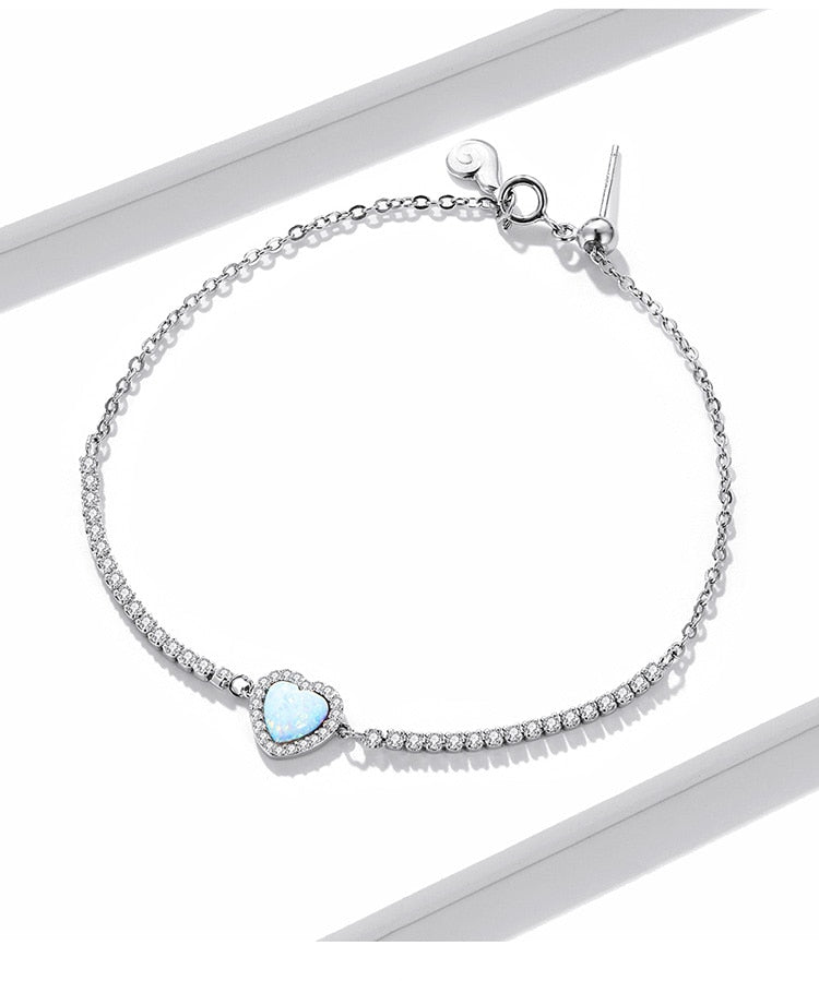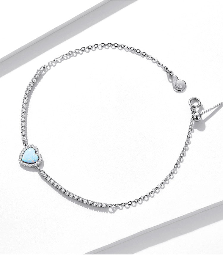 Aggiungi un tocco di eleganza eterea al tuo stile con il nostro bracciale a cuore in argento sterling 925 con opale . Questo accattivante pezzo presenta un cuore in opale splendidamente lavorato, incastonato in argento sterling 925 di alta qualità. Perfetto per aggiungere un pizzico di fascino e raffinatezza a qualsiasi outfit.